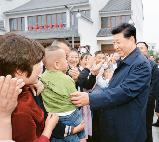 2019年9月16日至18日,中共中央總書記、國家主席、中央軍委主席習近平在河南考察。這是17日上午,習近平在信陽市光山縣文殊鄉東岳村同鄉親們親切交流,祝愿鄉親們生活芝麻開花節節高。 新華社記者 謝環馳/攝
