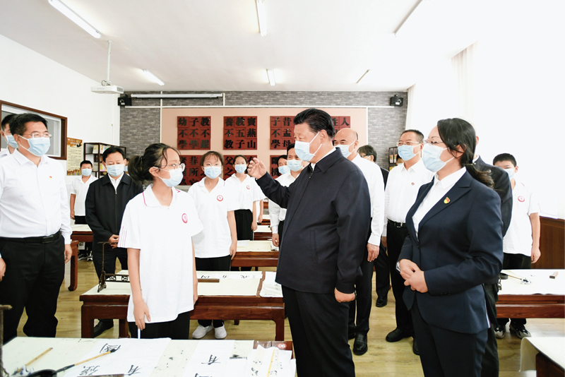 2021年9月13日至14日,中共中央總書記、國家主席、中央軍委主席習近平在陜西省榆林市考察。這是14日上午,習近平在綏德實驗中學考察時,同正在練習書法的學生親切交流。 新華社記者 李學仁/攝